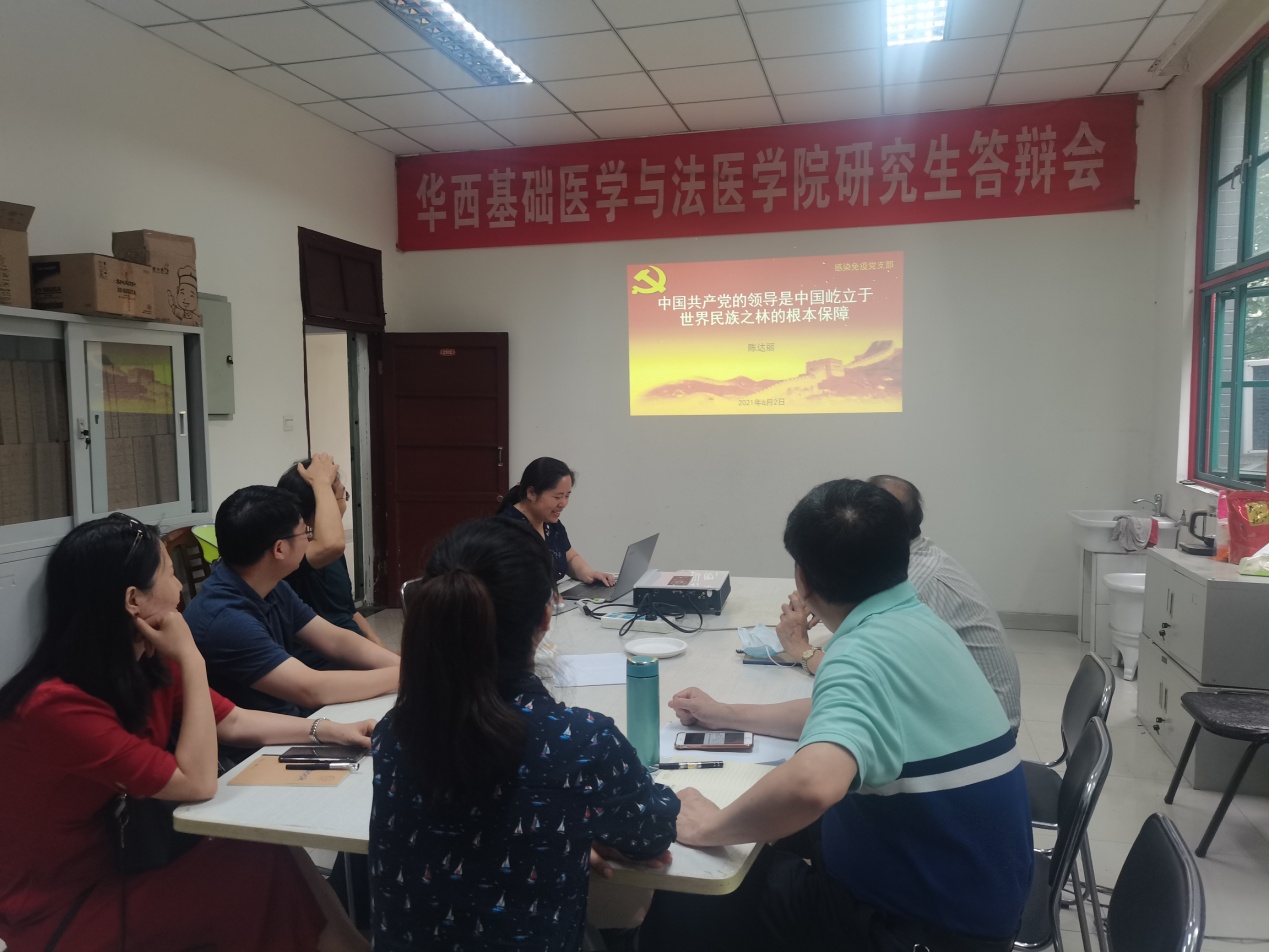 最后,支部书记陈达丽结合《关于党史学习教育的实施方案》以及感染免疫党支部的工作实际,就继续深入扎实开展党史学习教育提出了三点具体要求:一、继续深入学习党史,深刻认清党史学习教育的重大意义。教职工党员要带头深入学习党史,在学党史、悟党史、用党史上做好表率,务实有效地做好本职工作,给广大师生讲清楚马克思主义为什么行、中国共产党为什么能、中国特色社会主义为什么好等问题;二、要注重领悟,不能机械地学习党史,要准确把握党史学习教育的目标任务。教职工党员要有学党史、悟思想、办实事、开新局的行动自觉;三、协调平衡好党史学习和本职工作的关系,确保党史学习教育活动有序开展和落实。所有教职工党员都要积极行动起来,充分发挥专业优势,高标准、高质量地履行党史学习教育责任、提高站位,确保学到位、严到位、干到位,推动党史学习教育活动继续高质量开展,从党史中汲取奋进力量。
