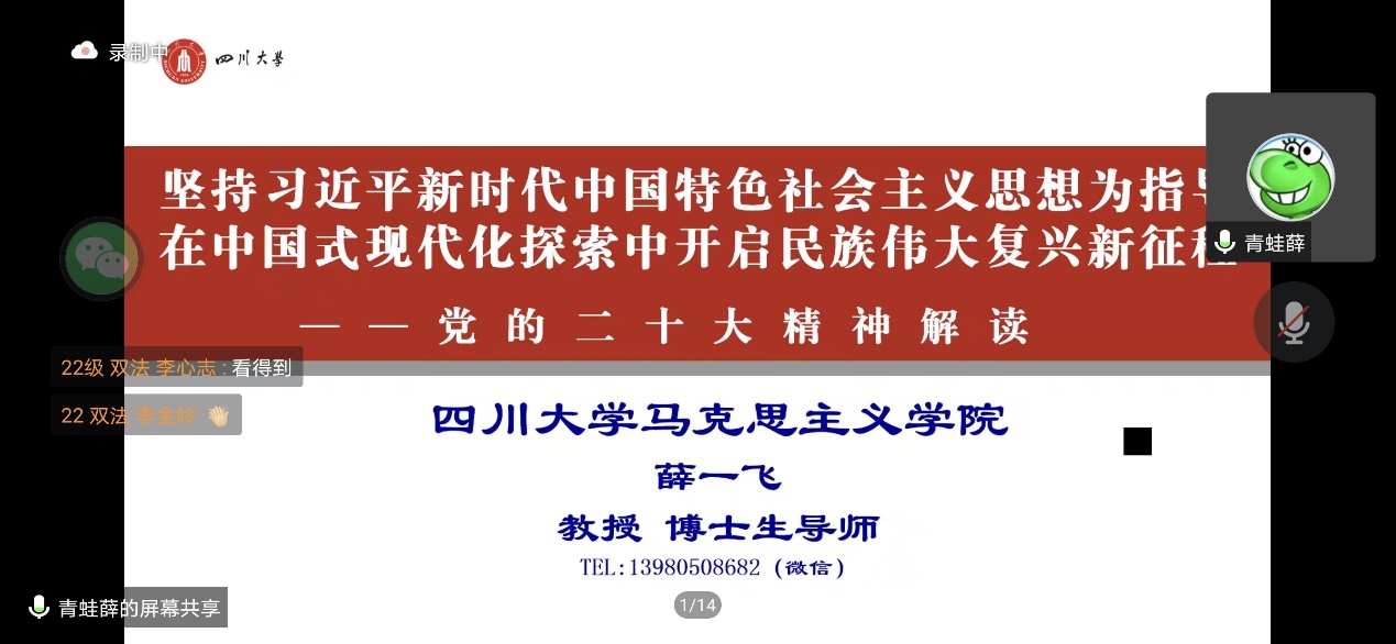 为深入学习贯彻党的二十大精神和习近平新时代中国特色社会主义思想,特别是习近平总书记关于青年工作的重要论述,进一步加强青年学生的理论武装,我院于11月18日下午举办党的二十大专题辅导报告暨“奋进二十大,永远跟党走”主题团校活动。马克思主义学院薛一飞教授、院团委书记董晓爱老师以及学院2022级全体团员参加了本次活动。