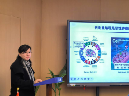 随后,活动进入了教学科研新思想、新观点、新论断交流的环节。生物治疗全国重点实验室的赵瀛兰教授为大家带来了题为“靶向肿瘤代谢的创新药物研究”的学术报告。赵教授以新型DHODH抑制剂、线粒体复合物抑制剂、饮食干预等为例,深入浅出地分享了靶向肿瘤细胞代谢的创新药物的研发成果及面临的挑战。她的报告不仅为在座的参与人员提供了宝贵的科研思路,更为大家开拓了视野,激发了创新思维。